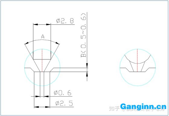 145.點澆口常有以下兩種形式,逃肉深B由材料、角度A等因素決定,常為0.5~0.6。ABS、PC材料,逃肉深度稍大些。