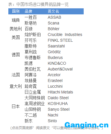 不過從市場現(xiàn)況看,我國模具鋼的競爭力沒有那么樂觀,進口模具鋼仍占很對優(yōu)勢。中高端模具鋼市場大部分被進口品牌分食。國內(nèi)鋼廠所占份額有限。市面上各國模具鋼品牌為數(shù)眾多,可以直觀地反映出這個現(xiàn)狀。