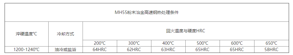MH55粉末冶金高速鋼耐磨性和韌性方面比較均衡,屬于鉬系高碳含鈷超硬型高速工具鋼,硬度高,可達(dá)65HRC,熱硬性好,高溫硬度高,容易磨削。用該鋼制造的切削工具,可以切削鐵基高溫合金、鑄造高溫合金、鈦合金和超高強度鋼等,但韌性稍差,淬火時溫度應(yīng)采用下限。由于可磨削性能好,所以可用來制造各種高精度復(fù)雜刀具。
